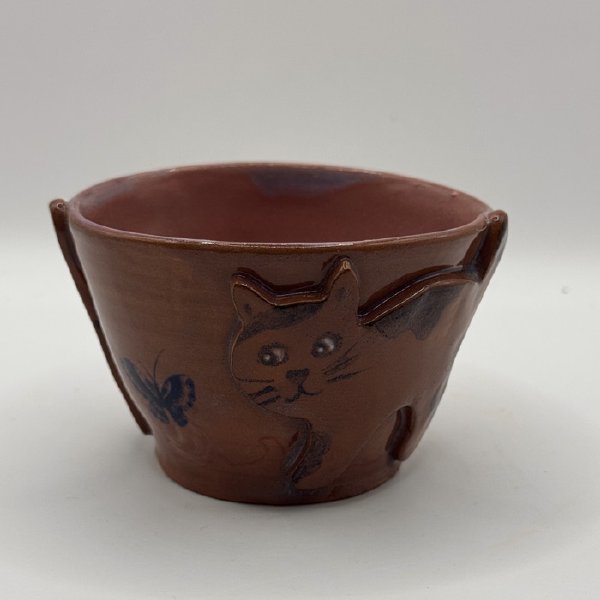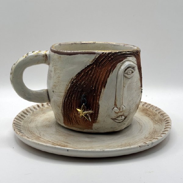 This hand-crafted ceramic cup features a unique, artistic face design with warm earthy tones and delicate details like…